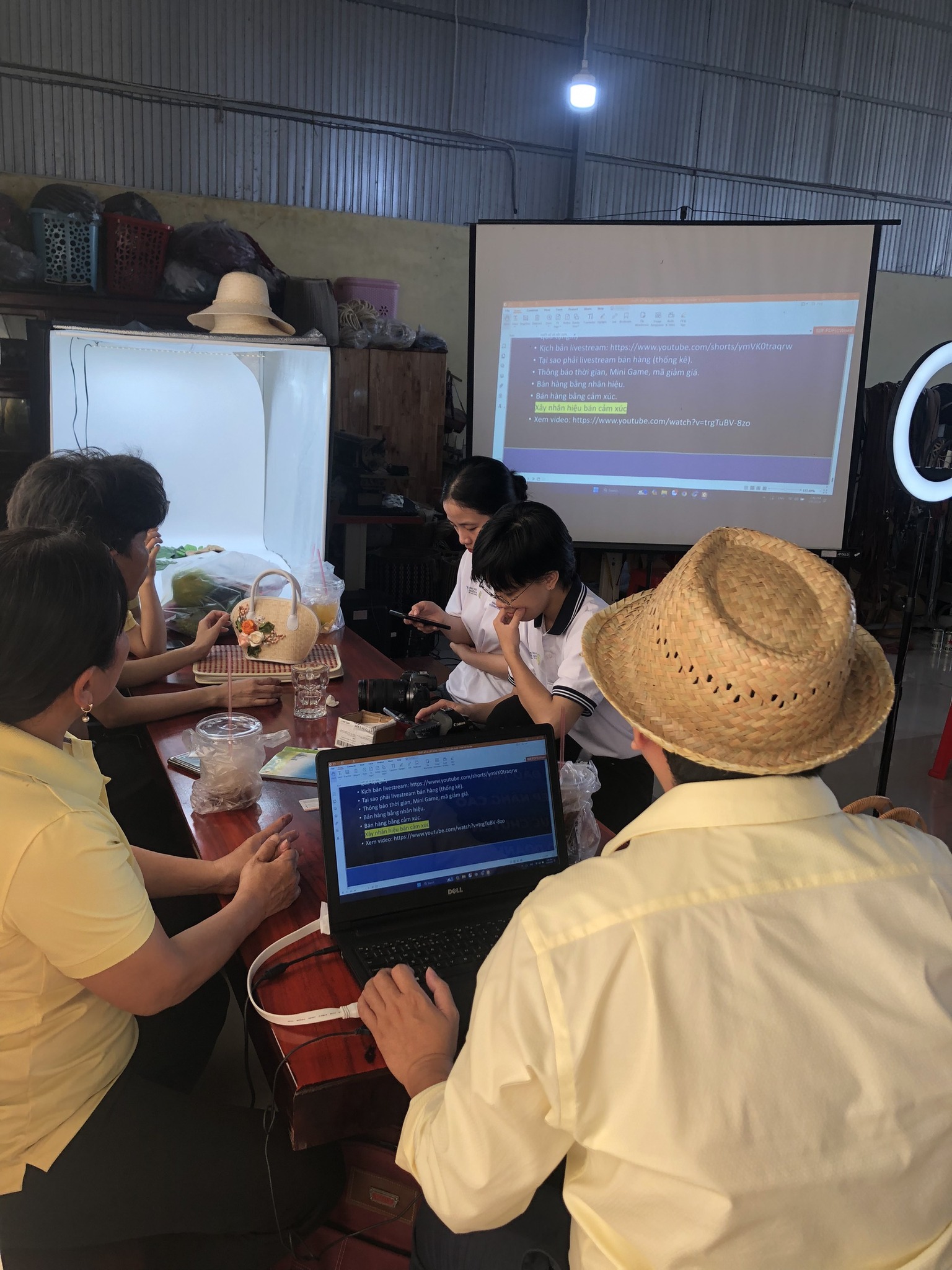 Buổi tập huấn tại Cơ sở dệt chiếu và hàng thủ công mỹ nghệ Tân Phú Hưng, học viên được hướng dẫn trực tiếp thực hành thực tế về kỹ năng kinh doanh online với các nội dung: (1) Hướng dẫn xây dựng thương hiệu sản phẩm: thực hành thiết kế logo, thiết kế bao bì sản phẩm trên phần mềm Canva; (2) Hướng dẫn một số kỹ thuật chụp ảnh sản phẩm; (3) Kỹ năng livestream bán hàng online trên Facebook; (4) Chạy quảng cáo trên Facebook.