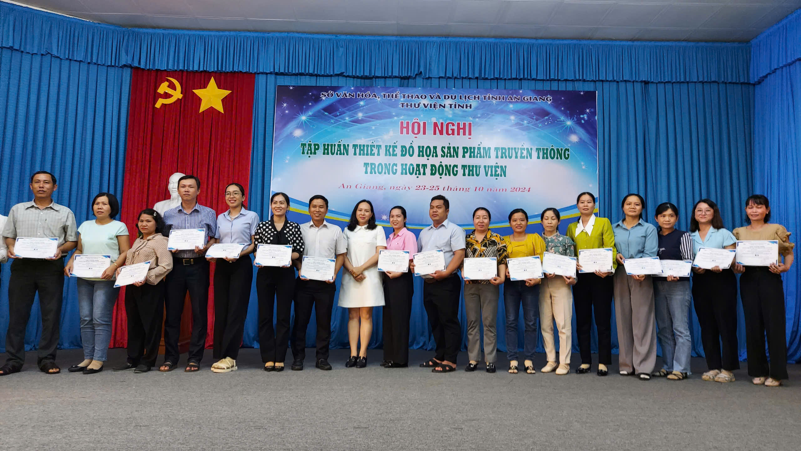 Từ ngày 23/10/2024 đến 25/10/2024, Trung tâm Tin học Trường Đại học An Giang đã phối hợp cùng Thư viện tỉnh An Giang tổ chức khóa tập huấn "Thiết kế đồ họa sản phẩm truyền thông trong hoạt động thư viện" tại Hội trường Thư viện tỉnh. Sự kiện có sự tham dự của gần 140 viên chức Thư viện công cộng và Thư viện trường học trong toàn tỉnh.